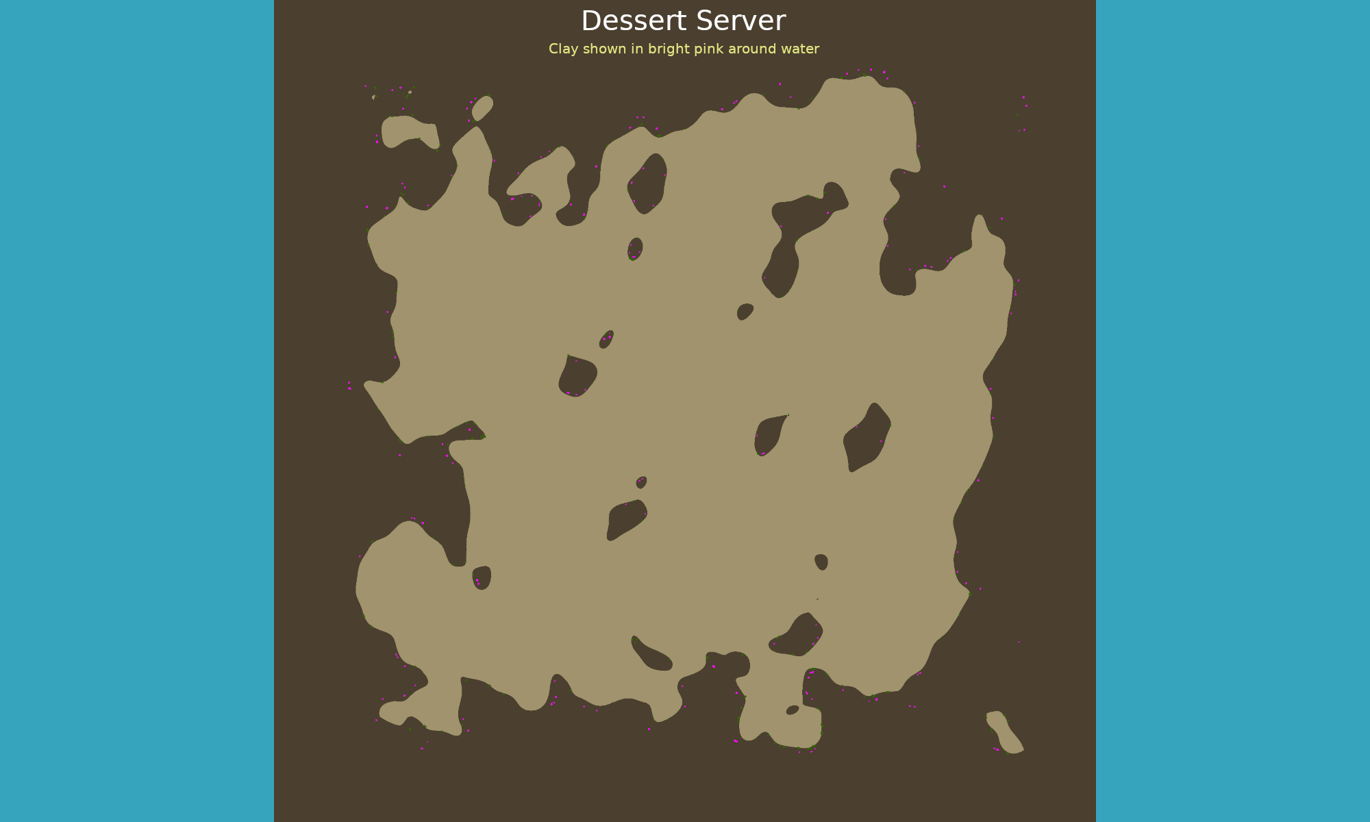 There are no iron veins on the Dessert server. Iron lumps may be found foraging from player planted grass, or searching rock faces after digging deeply to expose them. There are sparse sand and dirt beaches. Reeds and kelp grow under water. Clay is only located under water. Raising the ground by dropping sands will result in early clay use. A clay token may be won as a later Gobbler level reward. Players start with 1 ql tin shovel (fashioned from cans) and 5 piles of 3.2 kg thatch taken from the bedding in the Ark.